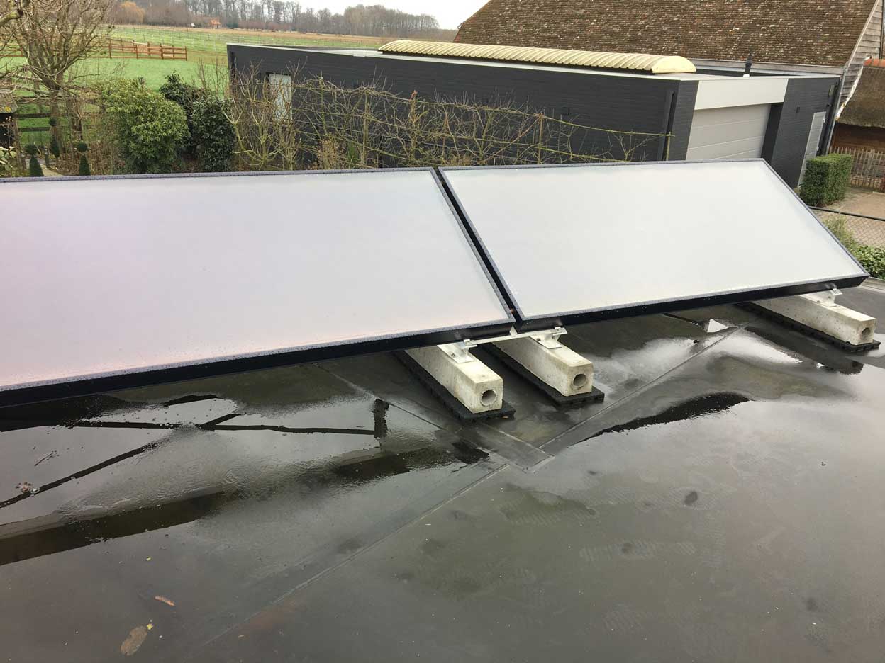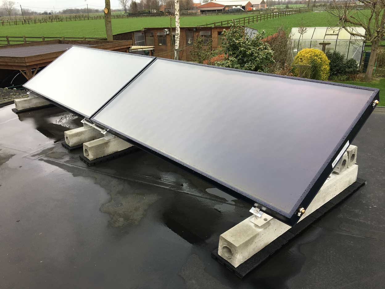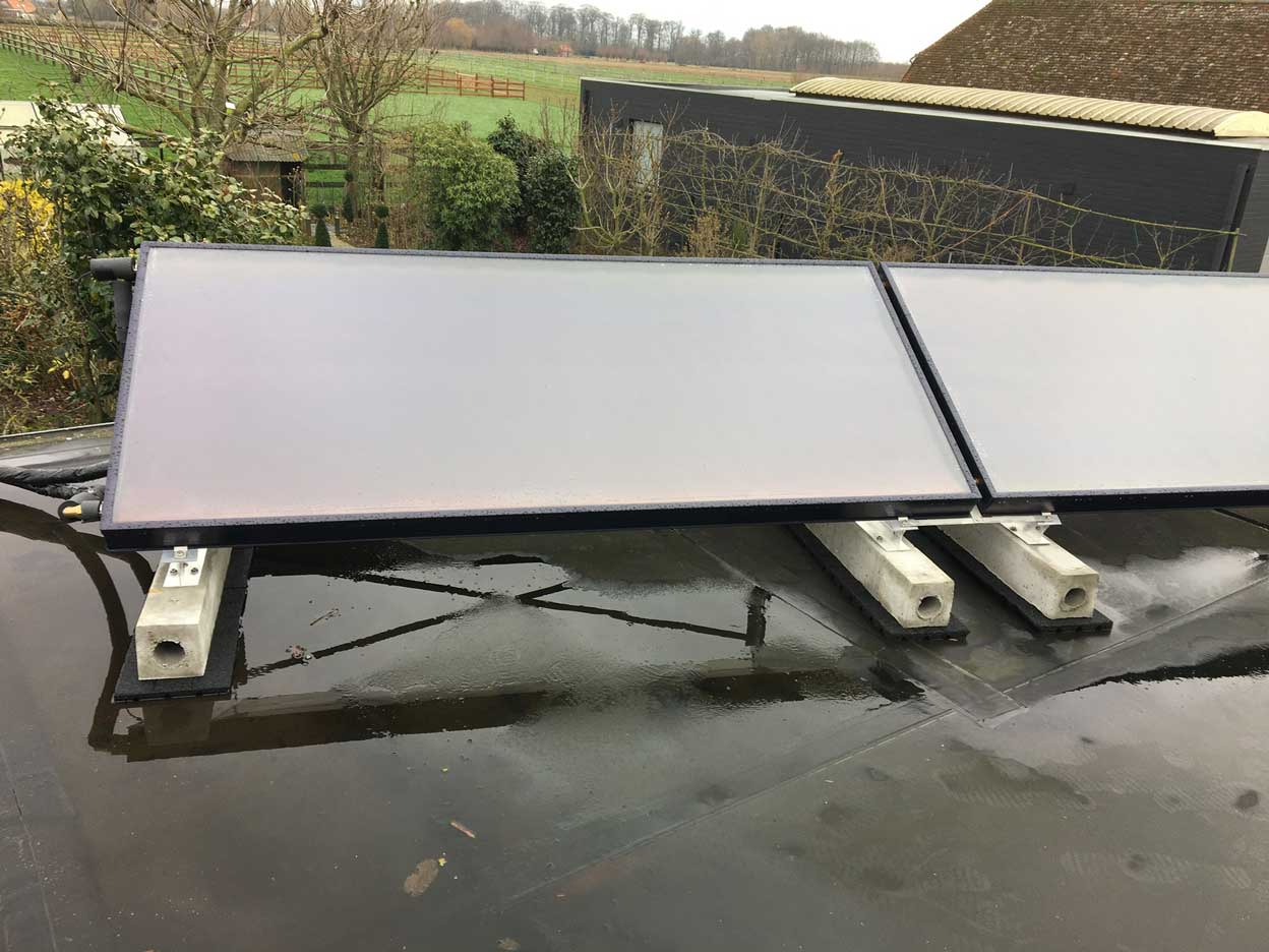 Plaatsen van zonneboilers. Installaties met een druksysteem, vlakke collectoren.